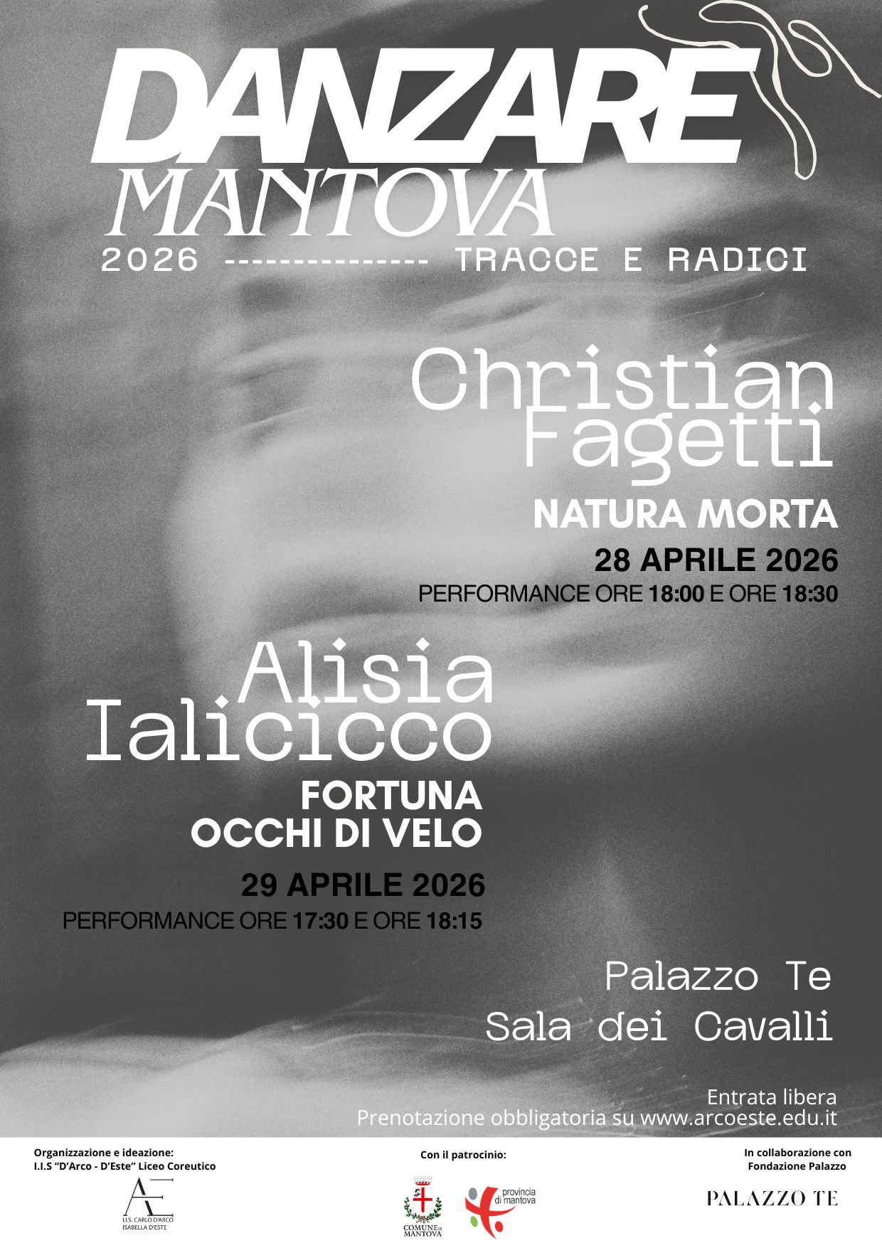 Torna a Palazzo Te la rassegna Danzare Mantova, realizzata in collaborazione con il Liceo Coreutico “D’Arco – D’Este”. Il 28 aprile sarà protagonista Christian Fagetti, con lo spettacolo Natura morta, in doppia replica alle 18:00 e alle 18:30. Nato a Rho (MI), Fagetti entra nel 2002 alla Scuola di Ballo del Teatro alla Scala, dove si diploma nel 2006; nello stesso anno entra a far parte del Corpo di Ballo del Teatro alla Scala, partecipando a numerose produzioni della compagnia, tra cui Romeo e Giulietta di Kenneth MacMillan. Il 29 aprile sarà invece la volta di Alisia Ialicicco, direttrice artistica della compagnia ANAM, con due coreografie Fortuna e  Occhi di velo, in scena alle 17:30 e alle 18:15.